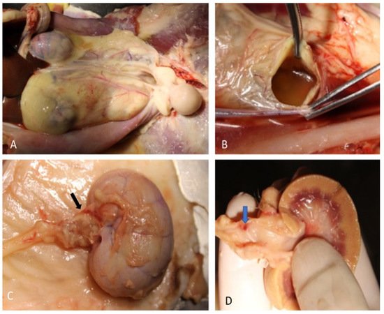 The postmortem examination showed a modest peritoneal collection of dense, yellowish, odorless fluid. After displacing the intestinal loops, in the left retroperitoneal space, an 11 × 5 cm ovoid cystic formation was detected (Figure 6A). The formation was adherent to the abdominal wall, strongly attached to the ventral sublumbar musculature, adherent to the capsular surface of the left lateral liver lobe, and extending towards the urinary bladder. Its incision revealed a collection of fluid with a strong urine smell (Figure 6B). The complete opening of the formation revealed that it totally englobed the left kidney, and the proximal portion of the ureter that was irregularly dilated particularly at the pelvic trait (Figure 6C). A longitudinal section of the kidney revealed a pale appearance of the parenchyma with yellowish chromatic shades and evident pyeloureteral ectasia. A 1.5 mm bright red lenticular area, along with an intense inflammatory reaction of the ureteral wall and periureteral tissues was also detected (Figure 6D). The opening of the bladder confirmed the presence of lithiasis; the remaining body tissues and organs were unremarkable.