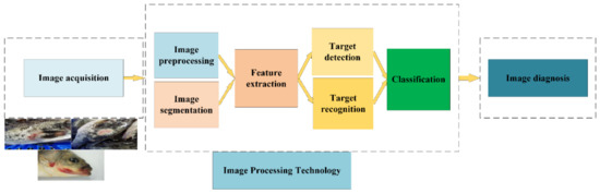 Image-processing technology has been used in aquaculture in various applications, such as fish weight/length measurement, fish classification/counting, fish detection/tracking/identification, and fish diseases [18,19,20]. However, fish disease diagnosis could be challenging because of the complexity of fish survival conditions, the diversity of fish diseases, and the heterogeneity of symptoms [16]. Image-processing technology aims to obtain higher quality and clearer images or to remove unwanted fuzzy data so that the computer can accurately diagnose and identify fish diseases [21]. The main steps encompassed by image-processing technology are image acquisition, image pre-processing, image segmentation, feature extraction, target detection and recognition, and classification [22], as shown in Figure 1.