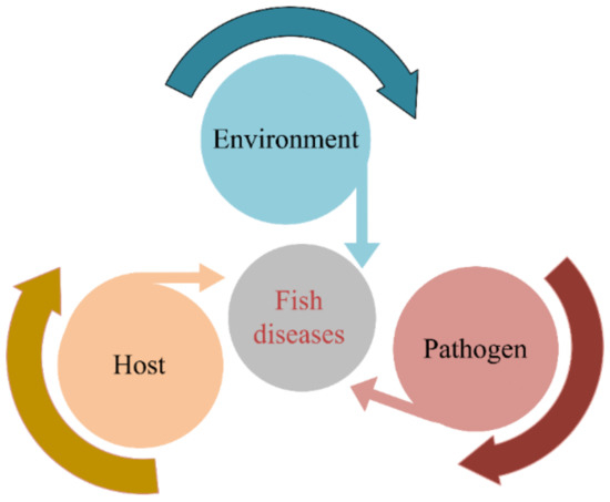 The image quality directly determines the accuracy of fish disease detection based on the image. The detection of disease using images includes two steps: the collection of high-quality images and the pre-processing of the acquired images. There are many different methods for acquiring images of fish in the aquaculture field, such as camera, microscopic, spectral, fluorescence, and ultrasonic imaging. Fish disease is attributed to the host, pathogen, and water environment, which contribute to disease in fish, as shown in Figure 2; thus, it could be diagnosed directly or indirectly via image acquisition in these three directions. According to the different acquisition methods, fish disease image acquisition can be divided into two categories; one is in the aquatic natural environment and the other is under external human intervention. Image acquisition in the aquatic natural environment is not affected by human interference, and these images are mainly used to detect diseases in fish by observing abnormal fish surfaces or abnormal fish swimming; the images mainly include: camera images, spectral images, and ultrasonic images. Image acquisition under external human intervention can cause damage to the fish, and this category mainly includes: expert systems, microscope images, and fluorescence images.