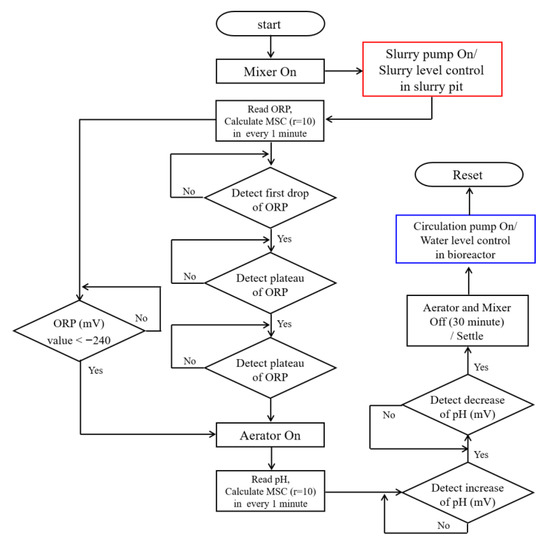 Figure 2 shows the flow diagram of the proposed algorithm. The operation started with the mixer-ON and the inflow of swine slurry into the bioreactor was controlled using the level sensor. An average of 60 values of ORP and pH in mV unit per minute were logged and used to calculate the moving slope change (MSC) to process the signal. The ORPmsc and pH(mV)msc were calculated using the sample sizes of every 10 values (r = 10) per minute and were displayed as a time profile trend. Furthermore, details on the data logging and processing have been reported in past studies [18,19]. In the anoxic phase, the real-time control point (nitrate knee point, NKP) was detected by tapping the ORPmsc (r = 10) or the absolute value of ORP (ORPabs). The ORPmsc and ORPabs were <−25 and <−240, respectively, indicating the detection of NKP and the completion of denitrification in the anoxic phase [20]. Such a trigger value was set to turn the subsequent operation based on continuous detection and following the previous lab scale study, i.e., in the anoxic phase, ORPmsc was below −20 for the first drop in ORP (FDO) and higher than −10 for the appearance of the plateau point (APP). In addition, ORPmsc was below −25 for the second drop in ORP (SDO), indicating the occurrence of NKP. Alternatively, the backup trigger value of −240 in ORPabs was incorporated as a safety measure in the algorithm for the identification of NKP in case it was not detected by ORPmsc. After acquiring the NKP, aeration was started immediately in order to lead the bioreactor operation into the aerobic phase. In the aerobic phase, the computer started the trapping of 0.4 and then −0.6 on the pH(mV)msc time-profile as a trigger value for the detection of NBP. NBP describes the completion of nitrification and corresponds to the real time control point in the aerobic phase [20]. Following the appearance of NBP on the pH(mV)msc-time profile, the aerator and mixer were turned off and settling was maintained for 30 min followed by the discharge of the supernatant to the slurry pit for circulation or storage. Afterwards, the operations were reset and a new cycle was started with the inflow of manure to the bioreactor.