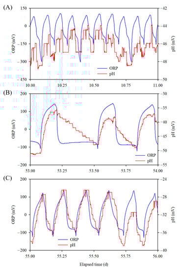 A total of 476 cycles were performed for 79 days and there were large variations in the cycles per day (1.5 to 13 cycles/d), as shown in Figure 3. In addition, the selected ORP and pH(mV)-time profiles, which reflect variation in the number of cycles (the numbers of cycles per day, were 10, 3, and 6 in (A), (B), and (C), respectively) are shown in Figure 4. These results demonstrated the clear performance of the real-time control technology in optimization, because manure would have been untreated or over-treated (deteriorating treatment capability and consuming energy) under a fixed time control condition. Normally, the variation in the number of cycles per day was not responded by a given operational time, but the bioreactor conditions such as the loading rate of manure and its composition, microbial activities and number, nutrient availability, temperature, and season.