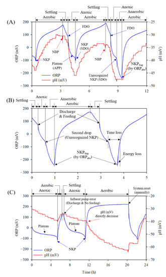 Comprehensive analysis of ORP and pH(mV) profiles obtained during the real-time of BCS: (A) NKP & ORPabs for denitrification detection, (B) ORPabs for denitrification detection, (C) Malfunctioning pump.