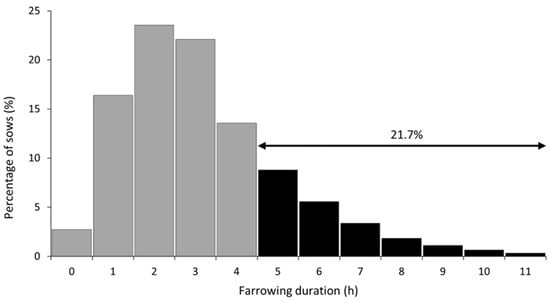 Prolonged farrowing duration can have adverse effects on both sows and piglets [8]. The incidence of intrapartum hypoxia in newborn piglets increases following a prolonged duration of farrowing [5]. Parturition is associated with many physiological processes, including both hormonal and behavioural changes, and is the most painful experience for females [9]. Moreover, the expulsion interval of each piglet is positively associated with SB [4]. As the concentration of colostrum IgG decreases by 50% within 6 h after the birth of the first piglet [10], the access of piglets to good-quality colostrum is reduced in sows with a long farrowing duration. Prolonged parturition may reduce piglet vitality at birth [1,5]. A previous study demonstrated that a higher proportion of piglets that attempted to stand after 5 min (38.5%) died compared to piglets that attempted to stand within 1 min (6.3%) after birth [11]. Moreover, retained placentae and uterine inflammation increase in sows with a long duration of farrowing [12]. Thus, sows with a long farrowing duration may have compromised reproductive performance. Oliviero et al. [13] found that 13% of sows that failed to get pregnant at the first insemination after weaning had a relatively long farrowing duration in their previous farrowing.