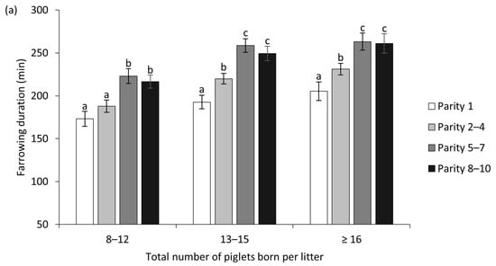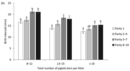 The duration of farrowing (a) and birth intervals (b) of sows among the total number of piglets born per litters and parities classes. a,b,c Different lowercase letters within the class of total number of piglets born per litter denote data that differ significantly (p < 0.05). Bars indicate standard error.
