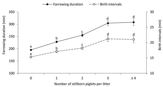 Farrowing duration and birth intervals of sows with different numbers of stillborn piglets per litter. a,b,c,d Different superscripts differ significantly (p < 0.05).
