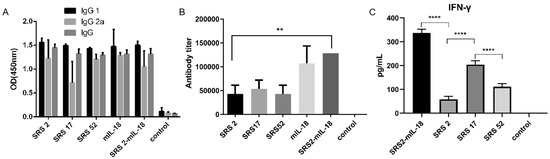 Chicago/Turabian StyleWang, Pu, Xiaocen Wang, Weirong Wang, Pengtao Gong, Nan Zhang, Renzhe Zhang, Huan Zeng, Qian Sun, Wanqing Li, Xin Li, and et al. 2022. "Evaluation of Protective Immune Responses Induced in BALB/c Mice and Goats by the Neospora caninum Surface SRS Proteins and Interleukin-18" Animals 12, no. 21: 2952. https://doi.org/10.3390/ani12212952