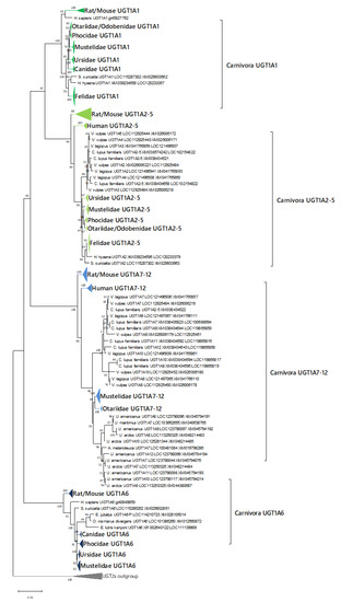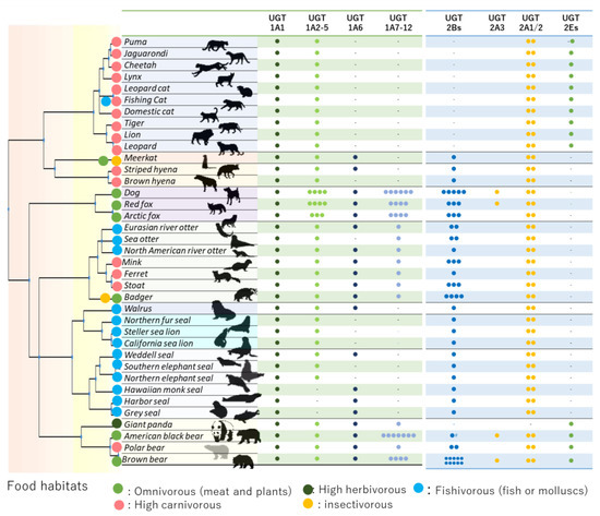 Recent studies on UGTs suggested strong genetic differences among Carnivora. Shrestha et al. (2011) [16] and Kakehi et al. (2015) [17] found a genetic dysfunction (pseudogene) in the major phenol-metabolizing enzyme UGT1A6 in Felidae, brown hyena (Parahyaena brunnea), and Otariidae. The carnivora-specific isoform UGT2B31 pseudogene also appeared to be present in all Felidae, indicating a limited capacity for glucuronidation [18]. Very limited numbers of UGT1A/2B isoforms were observed in these species, suggesting contraction of these genes during evolution [17,18].