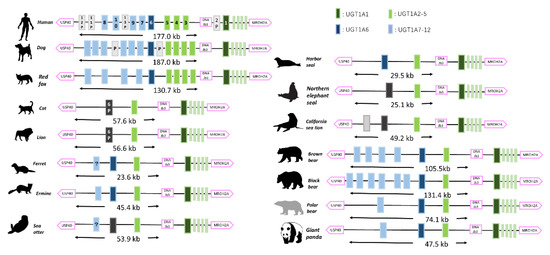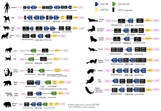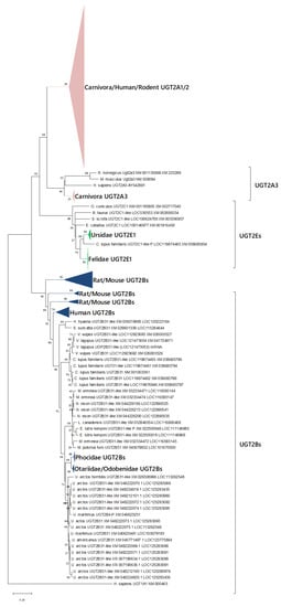 These reports strongly suggest the presence of a large genetic diversity in UGT even within Carnivora; however, no further Carnivora species have yet been examined in this regard. Recent improvements in WGS (whole genome sequencing) techniques allow us to utilize a large volume of genomic data from a variety of wild carnivorans [19]. These data enable the comprehensive investigation of evolutionary history, including gene duplication/loss events, and sequence comparisons of each isoform. In the present study, we utilized genomic data from a large variety of Carnivora species to evaluate the genetic synteny of each UGT. We also conducted phylogenetic analysis of each subfamily to analyze evolutionary inter-species differences in this enzyme superfamily.