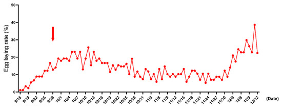 Egg laying rate of Zhedong white geese. The red arrow represents the sampling time point.