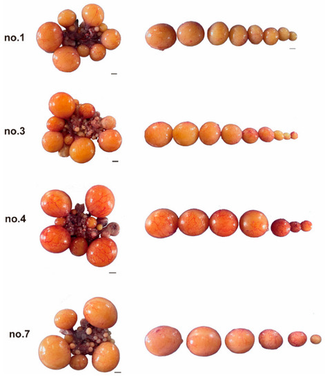 Morphology of ovary and follicle during the first clutch of egg-laying. Scale = 1 cm.
