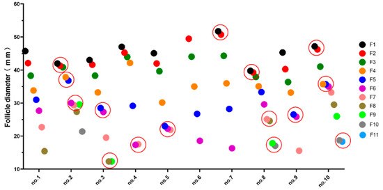 Follicular diameter in the first egg-laying cycle of the Zhedong white goose. The follicles enclosed within the circles are supposed to develop to produce double-yolked eggs.