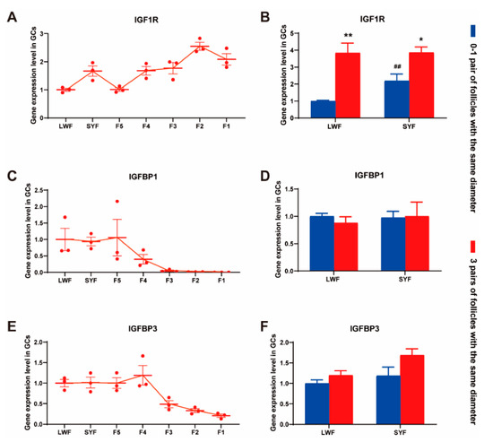 IGF1-related gene expression in granulosa cells. (A,C,E) IGF1R, IGFBP1 and IGFBP3 expression in granulosa cells of different follicles. Data are expressed as mean ± SEM (n = 3). (B,D,F) IGF1R, IGFBP1 and IGFBP3 expression in granulosa cells of small follicles divided into two groups (0–1 pair group and 3 pairs group). Data are expressed as mean ± SEM. * p < 0.05 and ** p < 0.01, compared to 0–1 pair group; ## p < 0.01, compared to LWF group.