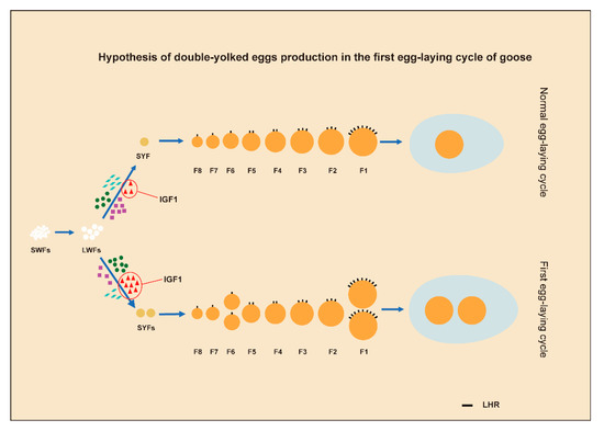 A schematic model of proposed roles of IGF1 and LH signals in producing double-yolked eggs.