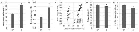 Heat stress factors and reproductive performance during summer of domestic sows. Atmospheric (A) and dermal (B) temperatures significantly (p < 0.05) increased in summer and both are presented as linear regression with a high correlation value (r = 0.582) (C). Significant (p < 0.05) reductions in reproductive performance such as pregnancy rate (D) and the number of littermates per delivery (E) are observed in the summer group. The values in B and C are obtained from 50 domestic sows (n in SP = 25 and n in S = 25). The values in (D,E) are based on each farm’s reproductive performance records (n = 5). Significant differences (p < 0.05) are indicated by superscripts * at the top of the bars. Graphs are presented as mean ± SEM. Abbreviations: SP, Spring group; S, Summer group; SEM, standard error of the mean.