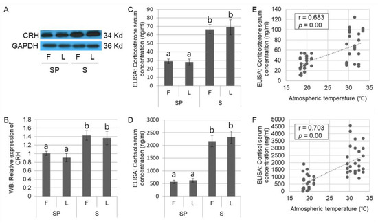 Assessment of stress in the domestic sows during summer. The representative images for CRH and GAPDH in Western blotting assay are presented (A). CRH expression is significantly (p < 0.05) increased in summer in Western blotting assay (B). Elevations of corticosterone (C) and cortisol (D) in summer are identified using ELISA and positive correlations between these stress hormones and atmospheric temperature are assessed (r = 0.683 in corticosterone and r = 0.703 in cortisol; (E,F). The Western blotting (A,B) is conducted using 32 samples (n in SP = 16 and n in S = 16), and the results by ELISA (C–F) are obtained from 50 domestic sows (n in SP = 25 and n in S = 25). Significant differences (p < 0.05) among groups are indicated by different letters at the top of the bars. Graphs are presented as mean ± SEM. Abbreviations: CRH, corticotropin-releasing hormone; GAPDH, glyceraldehyde 3-phosphate dehydrogenase; WB, Western blotting; ELISA, enzyme-linked immunoabsorbent assay; F, follicular phase; L, luteal phase.