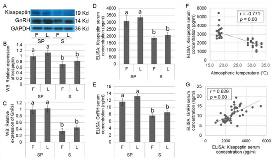Expression of the hypothalamic kisspeptin and its downstream hormone (GnRH) in domestic sows in different seasons. The representative images for Kisspeptin, GnRH, and GAPDH in Western blotting assay are presented (A). The hypothalamic kisspeptin expression was significantly (p < 0.05) reduced in the summer group than in the spring group (B). GnRH expression is consistent with the results of those of kisspeptin expression (C). In the ELISA assay, significant (p < 0.05) reductions of kisspeptin and GnRH in the serum were observable in the summer group, relative to the spring group (D,E). A highly negative correlation between kisspeptin expression and the atmospheric temperature (r = −0.771) or a positive correlation with the reduced kisspeptin and GnRH concentration (r = 0.629) is demonstrated (F,G). The Western blotting (A–C) is conducted using 32 samples (n in SP = 16 and n in S = 16), and the results by ELISA (D–G) are obtained from 50 domestic sows (n in SP = 25 and n in S = 25). Different letters at the top of the bars indicate significant differences (p < 0.05) among groups. Graphs are presented as mean ± SEM. Abbreviation: GnRH, gonadotropin-releasing hormone.