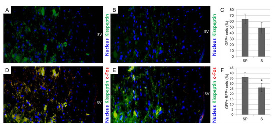 The activity of kisspeptin neurons in the region of PeN near 3V of the hypothalamus in the follicular phase of domestic sows in different seasons. Fluorescent immunohistochemical staining is conducted to identify nucleus (blue), kisspeptin positive cells (GFP), and c-Fos positive cells (RFP) in the region of PeN near 3V. Kisspeptin-positive cells (%) are more abundant in the summer group (A–C). Kisspeptin neurons co-expressing c-Fos (%) are significantly (p < 0.05) reduced in the summer group (D–F). Significant differences (p < 0.05) are indicated by superscripts * at the top of the bars. The fluorescent immunohistochemical staining is conducted using 18 samples (n in SP = 9 and n in S = 9). Graphs are presented as mean ± SEM. Magnification: ×200. Abbreviations: PeN, periventricular nucleus; 3V, the third ventricle; GFP, green fluorescent protein; RFP, red fluorescent protein.