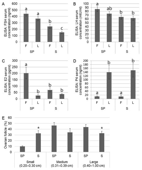 The development of ovarian follicles during the follicular phase is directly influenced by several reproductive hormones, including GnRH, FSH, and LH. In pigs, a general consensus is that ovarian follicles can be classified as small (0.20–0.30 cm), medium (0.31–0.39 cm), large (0.40–1.00 cm), and cystic [2,16]. According to these criteria, the ovarian follicles of the sows in the follicular phase (total n = 34; n in SP = 17 and n in S = 17) in response to different seasons were counted (%).