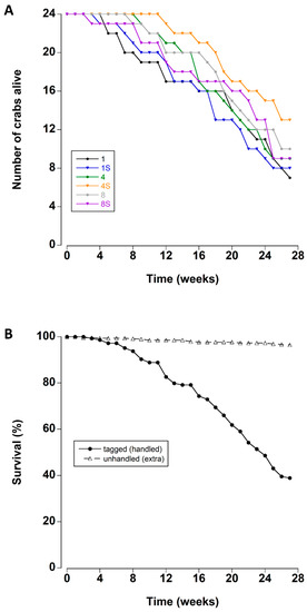 Overall the changes in the vitality indices became most noticeable after 8–11 weeks in captivity for tagged (handled) crabs. What this time period represents is unclear at present, but because survival of untracked, unhandled crabs was not affected to a similar degree, it suggests that the experimental manipulation and handling, rather than the diet or the actual experimental stocking conditions was a key factor.