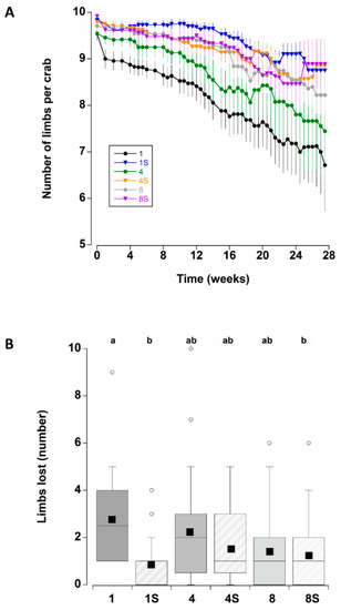 The total number of limbs lost was also compared between crabs that died during the experiment and those that remained alive (all six treatments combined) to determine if limb loss was an indicator of impending mortality: there was no significant difference between the two groups (Mann–Whitney U test, T = 4014, p = 0.426). Indeed, several crabs that lost no limbs died during the experiment, while one crab that lost all limbs (10) was still alive at week 27. When comparing the total number of limbs lost across all six treatments (Figure 2B) (combining crabs that died during the experiment and those that remained alive within each treatment), there were some significant differences (One-way ANOVA on ranks, H5 = 17.75, p = 0.003). Single crabs without a shelter lost more limbs than single crabs with a shelter (Tukey p < 0.05) and eight crabs with a shelter (Tukey p < 0.05; there were no significant differences among the other treatments (Tukey p > 0.05).