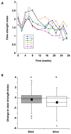 Apart from a transient decrease at two weeks (which was likely due to an equipment error; Figure 3A), the overall claw strength index remained unchanged with mean values of 1.7 ± 0.1 and 2.3 ± 0.1 units (Figure 8B) across all treatments during the first eight weeks in captivity. Thereafter, a significant decline occurred at 11 weeks, with a further decline at 27 weeks.