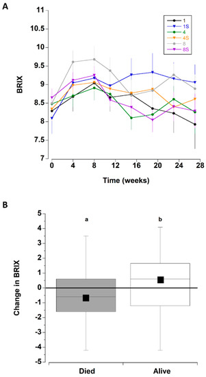 The overall initial mean BRIX values were 8.4 ± 1.4 °Bx; these increased during the next three monthly sampling periods (weeks 4–12). Thereafter, they declined to levels that were similar to initial measurements (Figure 4A and Figure 8C).