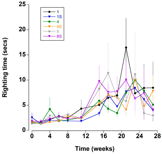 Righting time was typically quite rapid (<5 s); it was influenced by the position and number of limbs lost and these crabs were excluded from the analyses (see methods). The righting time remained relatively constant between mean levels of 1.8 ± 0.2 and 2.6 ± 0.3 s during the first 11 weeks (Figure 5 and Figure 8A). Thereafter, there was a sharp increase in righting times which remained elevated at between 5.5 ± 1.1 and 9.9 ± 2.1 s for the remainder of the experiment. It was noteworthy that during the experiment 22 crabs took an extended time to right (>60 s); of these 16 (73%), died within a week of these high readings.