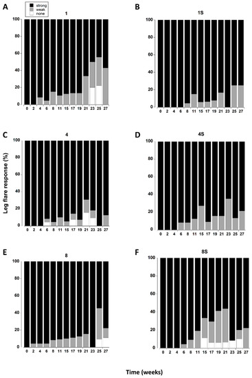 (A–F). Leg flare responses of C. maenas (mean ± SE) kept in densities of 1, 4 or 8 crabs, with (S) or without shelter. The flare response was classified as strong, weak or absent (Table 1) and expressed as a percentage of animals alive at each time period. If a crab died or lost both of its fourth pair of walking legs, or lost > 3 legs on one side it was not included in the measurements.