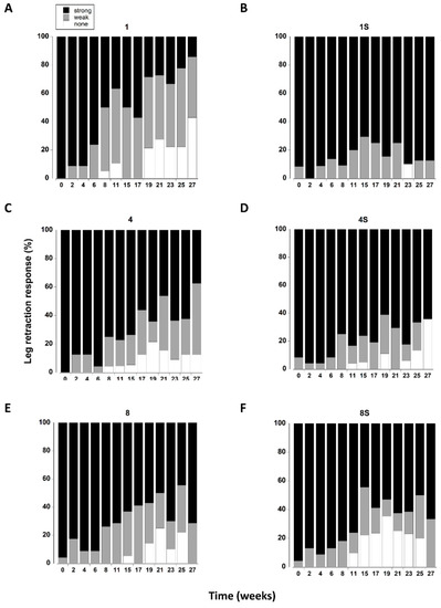 (A–F) Leg retraction responses of C. maenas (mean ± SE) kept in densities of 1, 4 or 8 crabs, with (S) or without shelter. The retraction response was classified as strong, weak or absent (Table 1) and expressed as a percentage of animals reaming alive at each time period. If a crab died or lost both of its first pair of walking legs, or lost > 3 legs on one side it was not included in the measurements.