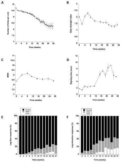 Data for all six treatments (density of 1, 4, 8 crabs, with or without shelter) combined to show changes over time. (A) Number of limbs remaining per crab. (B) Claw strength index (C) BRIX values and (D) righting time (seconds): data for these four graphs represent the mean ± SE. (E) Leg flare and (F) Leg retraction expressed as percentage of animals (remaining alive) exhibiting a strong, weak or no response.