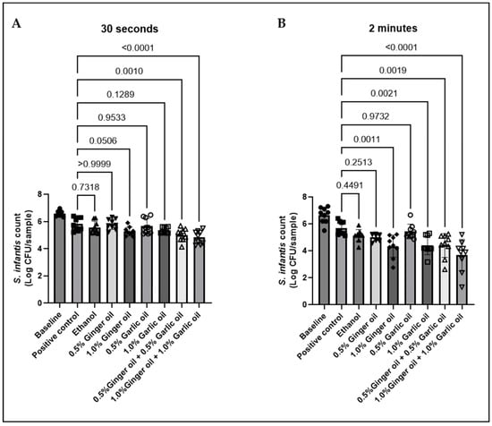 The antimicrobial activity of garlic and ginger oil against Salmonella on chicken skin was determined according to a previously published protocol [10,21]. A total of three independent experiments were conducted. Briefly, chicken skin samples were obtained from a local grocery store, aseptically cut into 4 cm × 4 cm pieces, and exposed to UV light for 15 min to ensure they were free of viable bacteria. Skin samples were randomly divided into 10 groups, with three pieces per group. Experimental groups included baseline (not dipped in solution), positive control (Butterfield’s Phosphate Diluent), ethanol alone, 0.5% garlic oil, 1.0% garlic oil, 0.5% ginger oil, 1.0% ginger oil, 0.5% garlic oil with 0.5% ginger oil, and 1.0% garlic oil with 1.0% ginger oil. Baseline samples were included to measure bacterial adherence to the skin, while positive control samples were dipped in Butterfield’s Phosphate Diluent to account for the bacteria that were washed off during submersion. For the ethanol group, ethanol was included at the same concentration found in the 1.0% garlic and ginger oil treatment (9.0% ethanol). Skin samples were inoculated with 50 μL of Salmonella Infantis (~8.5 to 9 CFU/mL). Following inoculation, samples were incubated for 30 min to ensure adherence of bacteria to skin samples. Inoculated samples were immersed in the respective treatment solutions for either 30 s or two minutes at 54 °C shaking, and then immediately transferred to 5 mL of Dey-Engley neutralizing broth (Difco Laboratories, Sparks, MD, USA) and vigorously vortexed for 30 s. The neutralizing broth was serially diluted (1:10) and placed on xylose lysine deoxycholate (XLD) agar plates (HiMedia Laboratories, Thane West, Maharashtra, India). To determine the effect of treatments on bacterial growth in the wash solution, treatment solutions were plated on XLD plates at 0 and 2 h post-treatment. Plates were incubated at 37 °C for 24 h for S. infantis enumeration.