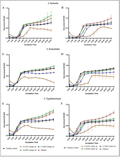 Previously, we demonstrated the ability of garlic and ginger oil to damage/kill the foodborne pathogen Campylobacter jejuni, inhibit its adhesion to chicken embryo cells, and reduce its quorum sensing [10]. Therefore, the goal of this study was to further determine the suitability of these oils as antimicrobials for poultry production by investigating their antimicrobial activity individually and the combination of both against three Salmonella serovars (S. enteritidis, S. typhimurium, and S. infantis) and to determine their possible mode of action.