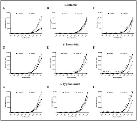 Effect of ethanol, ginger oil, and garlic oil at SIC dose on AI-2 levels of S. infantis (A–C), S. enteritidis (D–F), and S. typhimurium (G–I) determined by bioluminescence assay. Results are averages of two independent experiments, each containing duplicate samples (mean and STD). * p < 0.05; ** p < 0.01; *** p < 0.001; **** p < 0.0001.