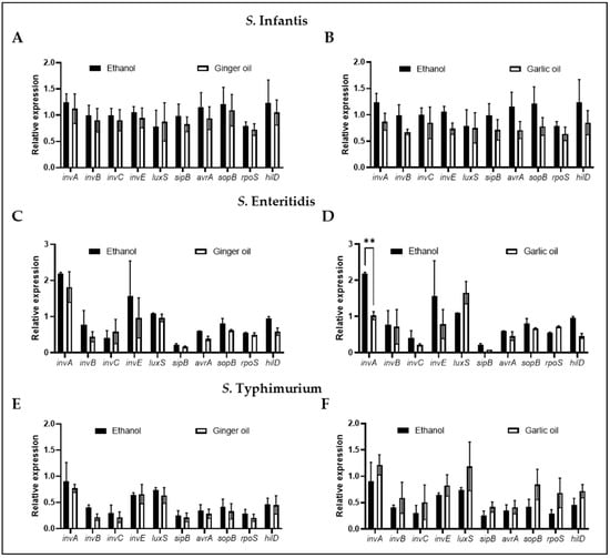 Effect of garlic and ginger oil on the expression of genes critical for survival and virulence was determined using qPCR. S. infantis (A,B), S. enteritidis (C,D), and S. typhimurium (E,F) (~6.0 Log CFU/mL) were incubated at 37 °C for 4 h in the presence of the SIC of phytochemicals. 16S-rRNA served as the endogenous control. Results are averages of four biological replications (mean and STD) and were considered significant at p < 0.05 (** p < 0.01).