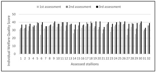 Without exception, the individual welfare quality scores for the third assessment were higher than those recorded in the first assessment, even where the second assessment score was lower (stallion no. 4) or equal to the first one (stallions no. 13 and 32), or when the second assessment score exceeded (stallions no. 5, 17, 18, 25, and 28) or equaled (stallions no. 7, 10, and 11) the IWQS recorded in the third assessment (Figure 1).