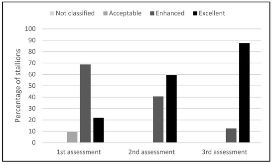 Three stallions were included in the ‘Acceptable’ class in the first assessment but none in the second and third assessments. The rest of the stallions were included in the two superior classes (enhanced and excellent), and their percentage in the ‘Excellent’ class increased from the first to the third assessment (Figure 2).