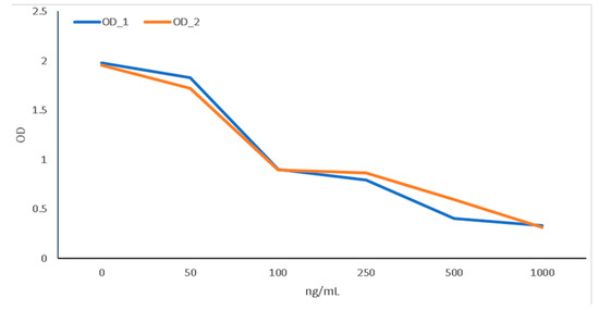 Across two replicates, there was a clear consistency in the relationship between OD reads and thrombin concentration in the standards (