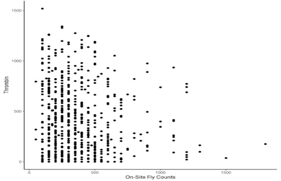 The majority of the assessed animals had a horn fly count below 500 with substantial variation in predicted thrombin. However, animals with high fly abundance (>800 flies) tend to have significantly lower predicted thrombin, as indicated in