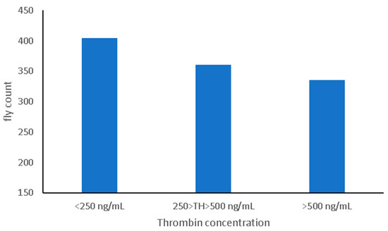 The Pearson correlation between predicted thrombin and HF count was −0.13, indicating a general decreasing trend in the number of flies with an increase in the amount of thrombin in the blood. When predicted thrombin was discretized into three classes with class boundaries chosen to achieve reasonable class size; there was a 22% difference in HF counts between the lowest and highest TH classes (
