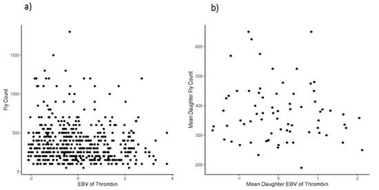 Figure 5a). This suggests that high levels of thrombin seem to deter high fly load; yet, the inverse trend that low levels of thrombin imply high fly count does not necessarily appear to be true and there are very likely additional biological factors (e.g., hair follicle density, skin thickness, other blood clotting factors, or behavioral avoidance) deterring flies in such cases where both thrombin and fly count are low. This trend between fly count and thrombin-estimated breeding values appears consistent within sire families as well (