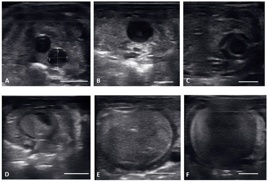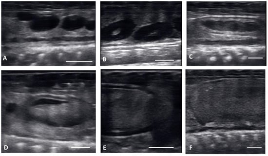 Ultrasound images are presented in Figure 1 in longitudinal plane, and Figure 2 in the transverse plane. Emerging from brumation, all females exhibited previtellogenic follicles, small, round, string-aligned anechoic structures, <1.5 cm in diameter (0.76 ± 0.42 cm along longitudinal plane). Previtellogenic follicles were the most abundant structures identified from 30 March to 15 April (Figure 1A and Figure 2A), depending on when follicles began to develop for each female. Previtellogenic follicles could be visualized between larger, more developed follicles in some females throughout the reproductive cycle.