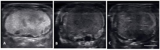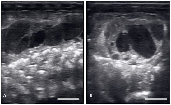 Images of multiple non-fertile post ovulatory follicles in degeneration. All the follicles had uneven outlines and non-uniform, heterogenous echogenicity. (A) The entire follicle became hyperechoic, this follicle had to be surgically removed. (B) uneven outline and large anechoic areas, this female laid unfertilized slugs. (C) thick hyperechoic uneven edges forming with small anechoic pockets dotting the hyperechoic follicle; these follicles were reabsorbed.
