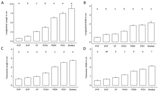 Column graph showing the increase in length and width on longitudinal plane (A,B) and length and width on transverse plane (C,D) according to the stage of the follicles for 11 female Louisiana pinesnakes. Abbreviation definitions are in Table 1, bars represent Mean ± s.d. and different letters over the bars indicate statistically different groups as determined by a Kruskal–Wallis non-parametric statistical test followed by a Dunn’s post hoc test with a Benjamini-Hochberg correction for multiple comparisons.