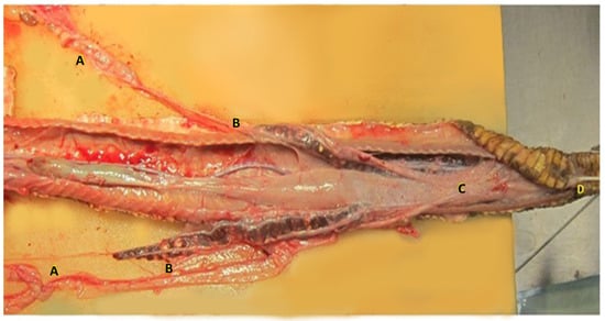 Dissection of the female genital system of the Louisiana pinesnake. The caudal third of the animal is shown. The right ovary is located cranially to the left, as it is described in most snakes (A). The two oviducts divide and run parallel to the colon (C), turning upward and sliding ventrally to the surface of the kidney in close contact to the ureters (B). The two vaginas appear enclosed in a single serosa that runs upon the urodeum and coprodeum, in the right vagina a 3 french tom cat catheter was inserted (D) cloaca.