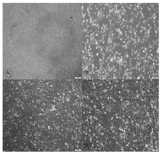 In vitro cultivation of granulosa cells. (A) Freshly isolated granulosa cells. (B) Granulosa cells cultured for 24 h. (C) Granulosa cells cultured for 48 h. (D) Granulosa cells cultured for 72 h.