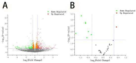 Volcanic map of differentially expressed mRNA and miRNA. The volcanic map shows the number of differentially expressed genes and miRNAs in the control and test groups. Red and green represent the upregulated and downregulated genes and miRNAs.