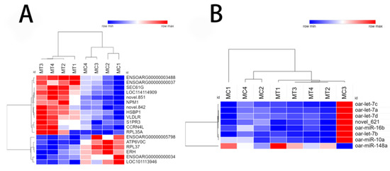 There were 1303 differentially expressed genes in the MC and MT groups of ovarian granulosa cells, among which 613 genes were downregulated, and 692 were upregulated. Seven differentially expressed miRNAs were downregulated, and one was found to be upregulated (Figure 4). Further analysis revealed that NPM1 (nucleophosmin 1) and ERH (ERH mRNA splicing and mitosis factor) were significantly downregulated (p < 0.05). However, HSBP1 (heat shock factor binding protein 1), RPL35A (ribosomal protein L35a), and other genes were significantly upregulated (p < 0.05). Moreover, miR-148a was significantly upregulated (p < 0.05), while let-7a, let-7b, let-7c, and miR-10a were significantly downregulated (p < 0.05). Cluster analysis heat maps were drawn based on transcription levels in the MC and MT groups (Figure 5). The maps showed that these mRNAs and miRNAs were well clustered and significantly upregulated or downregulated in the samples.