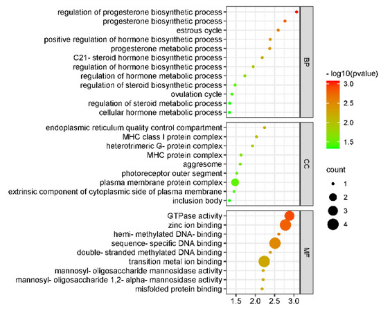 GO function annotation of miRNA-negative related target genes in the kisspeptin-treated test and control group was prepared. According to the results of the GO database, a total of 622 GO terms were annotated. The cellular component was annotated to the endoplasmic reticulum quality control compartment and MHC class I protein complex. The biological process was annotated to regulate the progesterone biosynthetic process and the estrous cycle, and the molecular function was annotated to GTPase activity and zinc ion binding. The most significantly enriched GO entries for mRNA and miRNA are shown in Table 4.