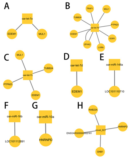 miRNAs are primarily regulated in a negatively correlated manner with the predicted target genes in animals and eukaryotes. In this study, we predicted the target genes of miRNA. Analysis of miRNAs and mRNAs’ associations revealed 16 miRNA-mRNA pairs with negative regulation, forming 22 pairs of targeting relationships. Moreover, the co-expression network of miRNA-mRNA was drawn and it was found that eight miRNAs were in the center of the network, regulating 22 genes (Figure 9), while one miRNA could regulate multiple target genes at the same time. Oar-let-7b could simultaneously regulate TRAF1, MUL1, PTPN23, EGR1, LVRN, ZFHX2, EDEM1, and TUBB2A genes. The EDEM1 gene also simultaneously regulated oar-let-7a, oar-let-7b, oar-let-7c, and oar-let-7d. The gene EGR1, regulating steroid hormone production, targeted the oar-let-7b, while oar-miR-10a targeted the HNRNPD gene. Figure 10 shows the mRNA protein interaction analysis. The interaction diagram between the genes was drawn by selecting the genes with the top 100 confidence levels from the string database.