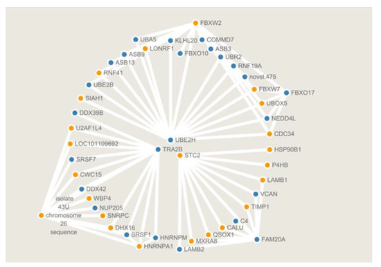 Interaction relationship between functionally related genes and target genes. Each node represents a different gene. Orange nodes represent the upregulation of the gene and blue nodes represent the downregulation of the gene. The line represents the existing interaction relationship. It can be seen intuitively from the figure that genes such as UBE2H, TRA2B, STC2, FBXO17, and FBXW2 have critical regulatory functions in this interaction network.